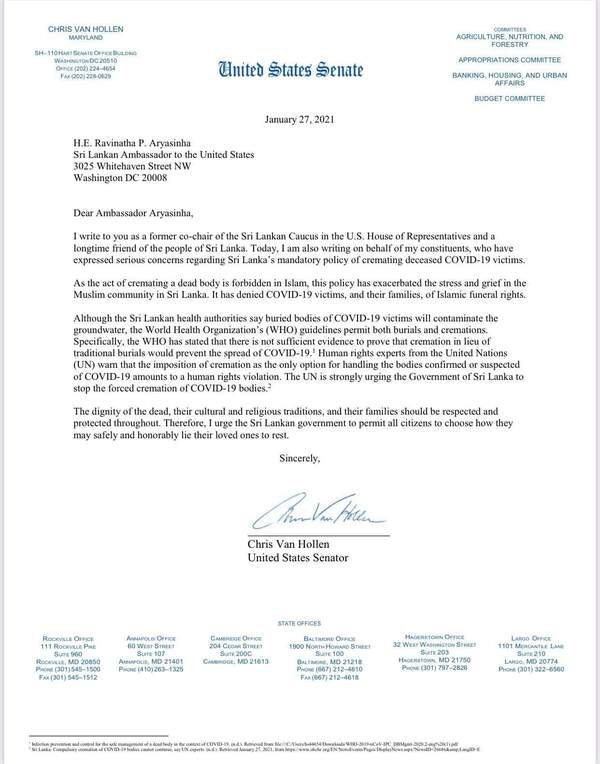 ‘කොවිඩ්-19’ ආසාදනය වීමෙන් මිය යන පුද්ගලයන්ගේ මළ සිරුරු සම්බන්ධයෙන් අවසන් කටයුතු කිරීමේදී ඇති එකම විකල්පය ආදාහනය යැයි තීරණය කිරීම මානව හිමිකම් උල්ලංඝනය කිරීමකට මුල පුරන බවට එක්සත් ජාතීන්ගේ මානව හිමිකම් විශේෂඥයන් අනතුරු අඟවා ඇතැයි ඇමෙරිකා එක්සත් ජනපදයේ සෙනට් සභිකයකු වන ක්රිස් වැන් හොලන් මහතා ඇමෙරිකාවේ ශ්රී ලංකා තානාපති රවිනාථ ආර්යසිංහ මහතා වෙත ලිපියක් යවමින් කියා සිටී.