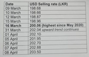 The rupee fluctuated in an upward trend from Rs.198.66 on March 10, Rs. 198.87 on March 12, Rs.198.96 March 15, Rs. 200.06 on March 16, Rs 202.04 on March 31, Rs.202.10 on April 01, Rs. 201.95 on April 05, Rs. 202.70 on April 06, Rs. 202.88 on April 07 and Rs. 203.50 on April 08.
