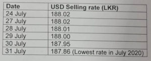 This was indicated in the data of rupee selling price against the dollar during this period which was Rs.182.02 on July 24, Rs.182.02 on July 27, Rs.188.01 on July 28, Rs.188. on July 29, Rs.187.95 on July 30, and Rs.187.86 on July 31.