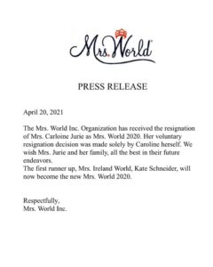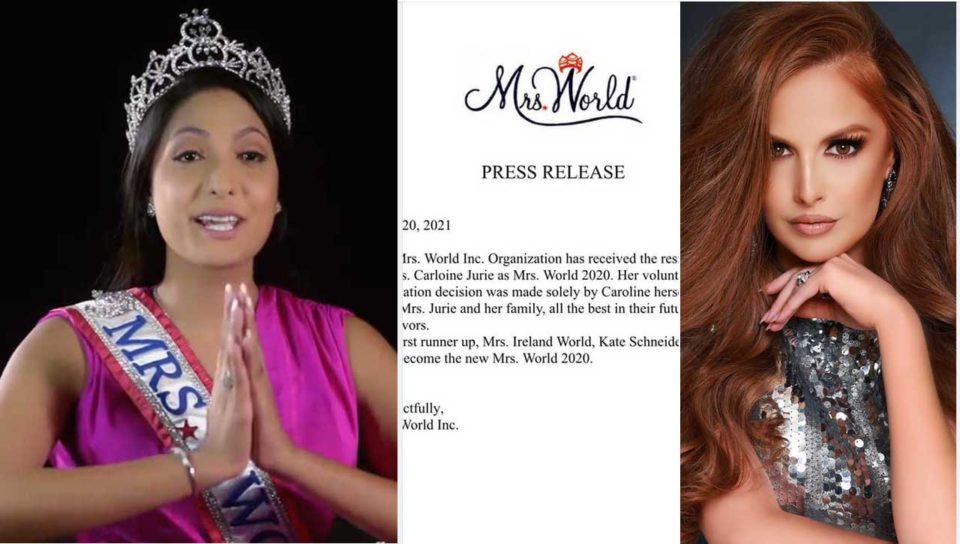 කැරලයින් ජූරි විසින් විසින් හිමි කරගන්නා ලද 2020 ලෝක විවාහක රූ රැජින කිරුළ ඇය විසින්ම අත්හැරීමෙන් පසු එය එම තරගයේ දෙවැනි ස්ථානය දිනූ අයර්ලන්තයේ කේට් ෂිනයිඩර් වෙත පිරිනැමීමට ඇමරිකාවේ මිසිස් වර්ල්ඩ් සමාගම කටයුතු කර ඇත.