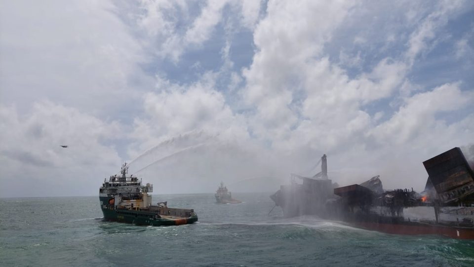 External fire-fighting using foam and boundary cooling by sea-water along the entire length of vessel from either side is under progress and continuous monitoring of vessel’s draught, list conditions and presence of hazardous and noxious substances overboard is being undertaken. Quantity of combustible material onboard is estimated to be limited. The ICG ships will continue to assess the situation and the decision to board or approach closer to the vessel will be taken after fully dousing the fire and undertaking sufficient boundary cooling.