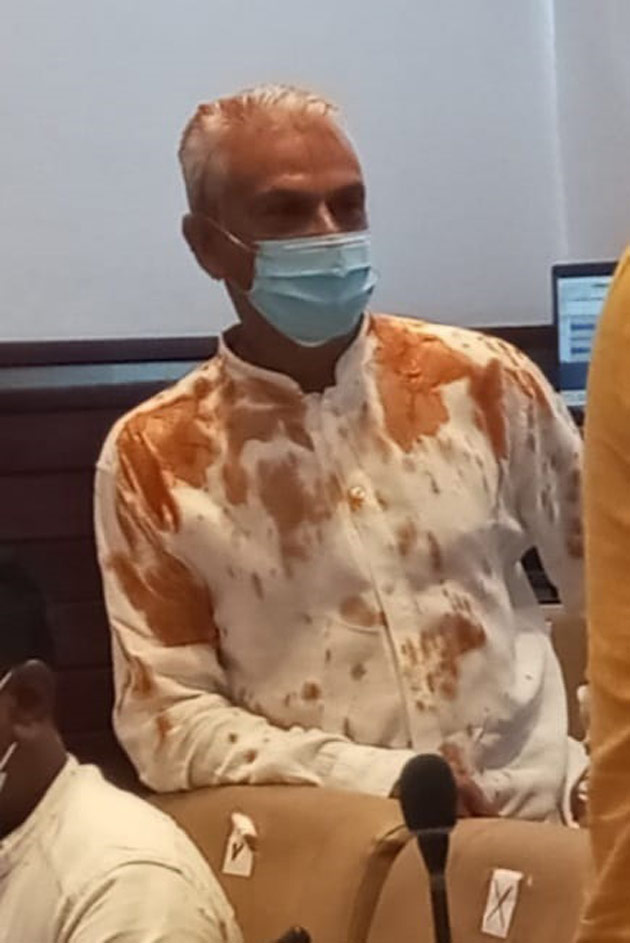 එම බෑගය වැනි දෙයක් ප්රදීප් ජයවර්ධන මහතාගේ හිසට වැදී පුපුරා ගිය බව ද ප්රදිප් ජයවර්ධන මන්ත්රීවරයාගේ මුළු ශරීරයම දුගඳ හමන කුණු බිත්තරවලින් පෙඟී ගිය බව ද ඔහු කීය.