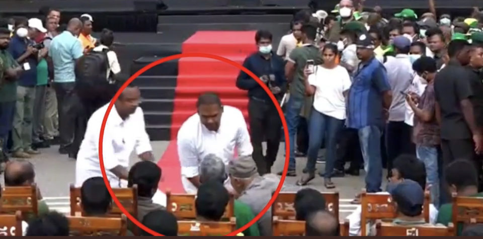 සමගි ජන බලවේගයේ මැයි රැළියේදී මුල් පෙළ අසුන් ගෙන සිටි පාර්ලිමේන්තු මන්ත්රී සරත් ෆොන්සේකා මහතා විසින් පාර්ලිමේන්තු මන්ත්රී හරීන් ප්රනාන්දු මහතා තමා අසලට කැඳවා ඇති අතර එම අවස්ථාවේ ඔවුන් දෙදෙනා බහින් බස් වී ඇත.